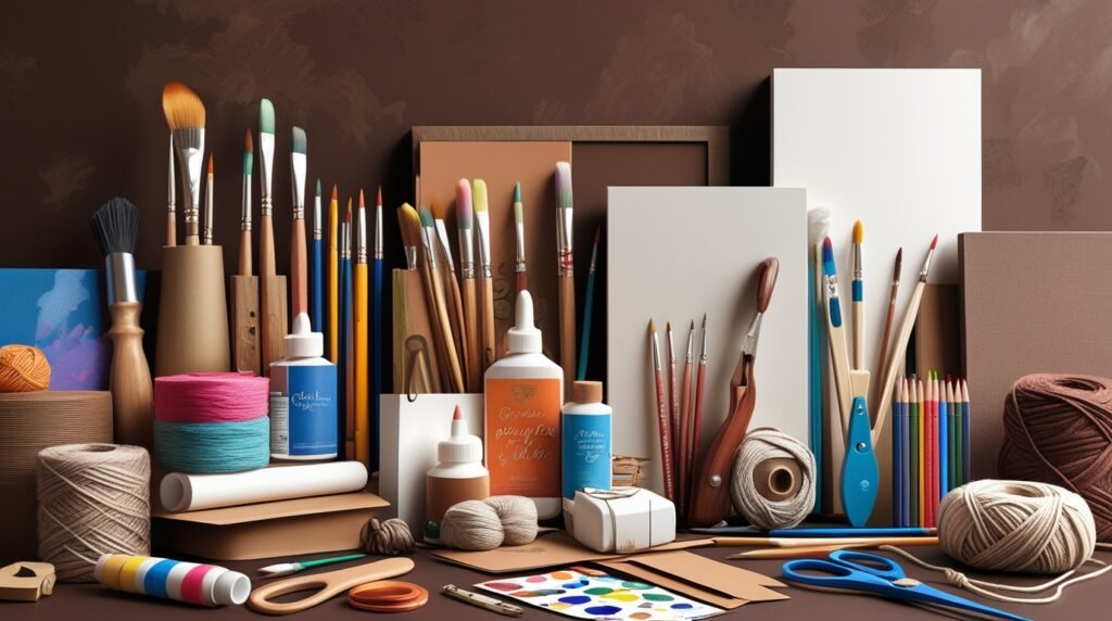 Various art supplies are arranged on a white surface, including black poster color jars, paintbrushes with orange handles, and an eraser. The background is softly blurred, indicating a creative workspace.